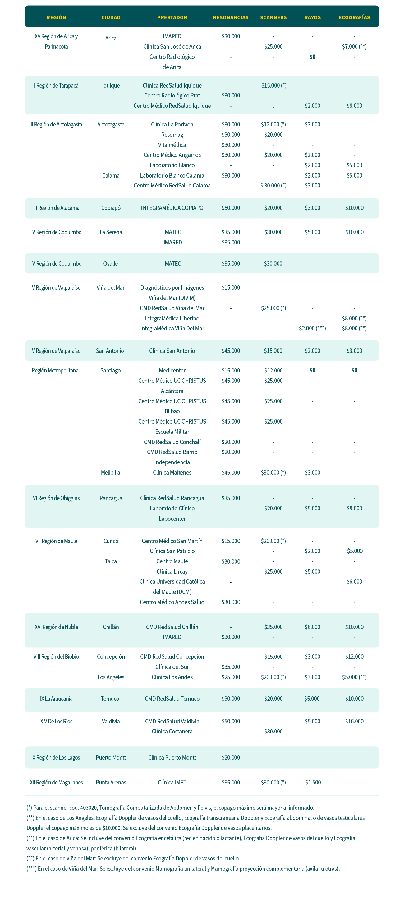 (*) El copago en imágenes es máximo, es decir, dependiendo de tu plan, éste incluso podría ser menor. Pueden existir tipos de imágenes específicas que se encuentren fuera de los copagos informados. Los copagos máximos señalados tienen una vigencia temporal, pudiendo modificarse y/o eliminarse en el futuro. Beneficio aplica sólo para prestaciones que los prestadores realicen en cada sucursal. No aplica para planes cerrados. No aplica mediante reembolso.